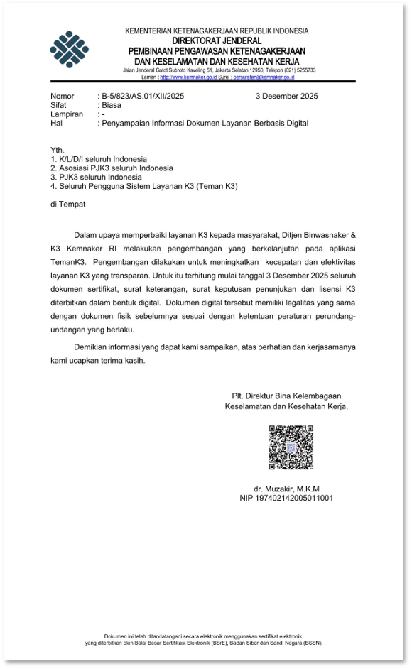 The digitalization of K3 documents through TemanK3 is not just about turning paper into PDFs. It is a concrete step to accelerate services, strengthen transparency, and simplify verification of K3 documents across Indonesia.